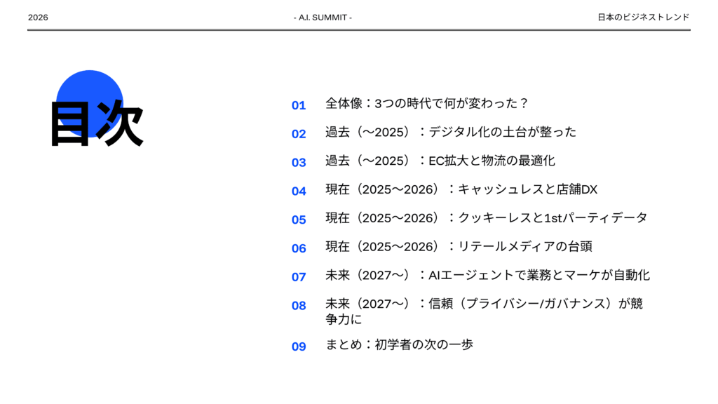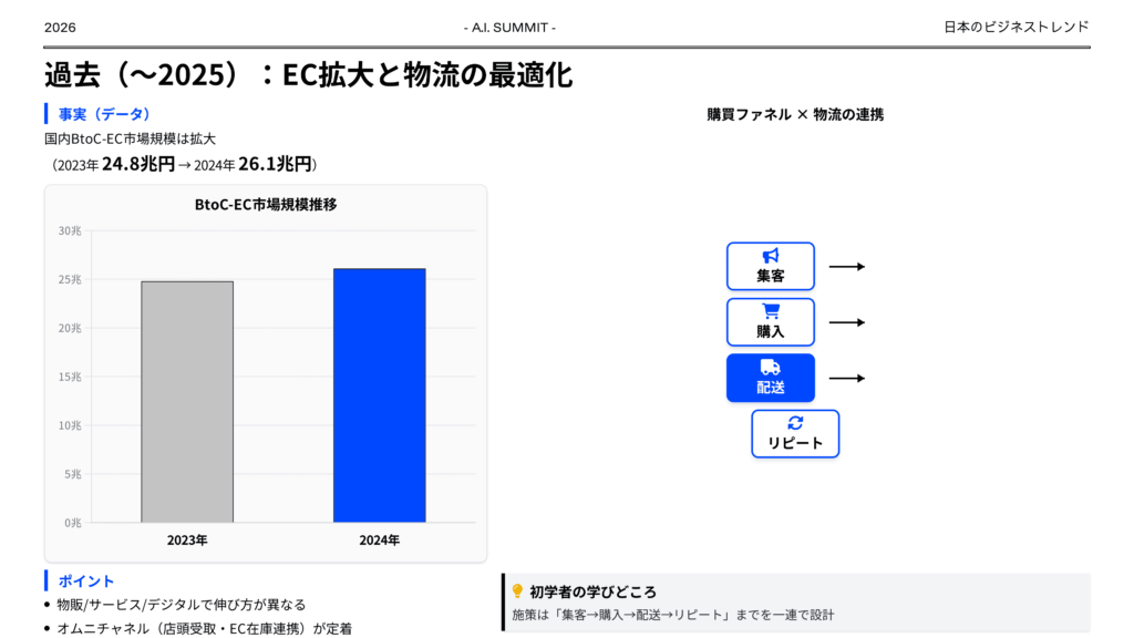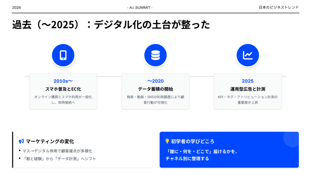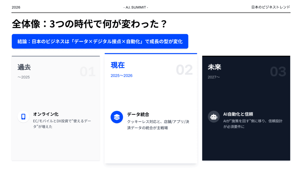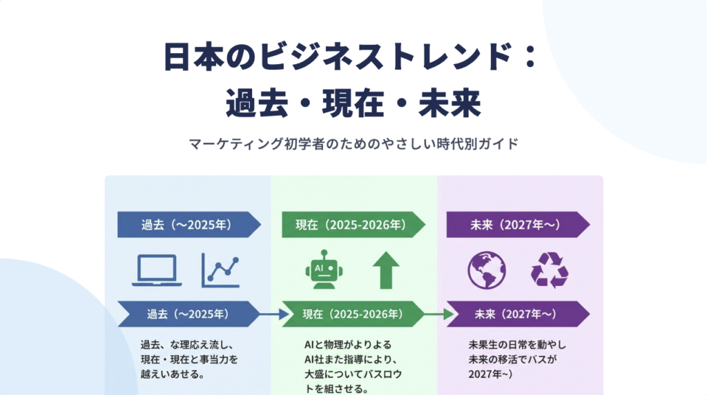日本のビジネストレンドを過去、現在、未来の観点でまとめてください。