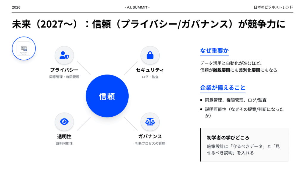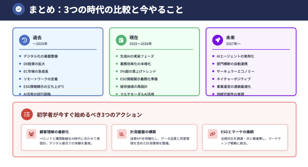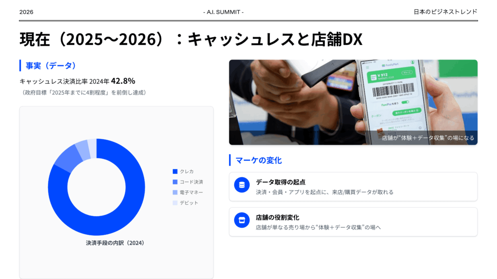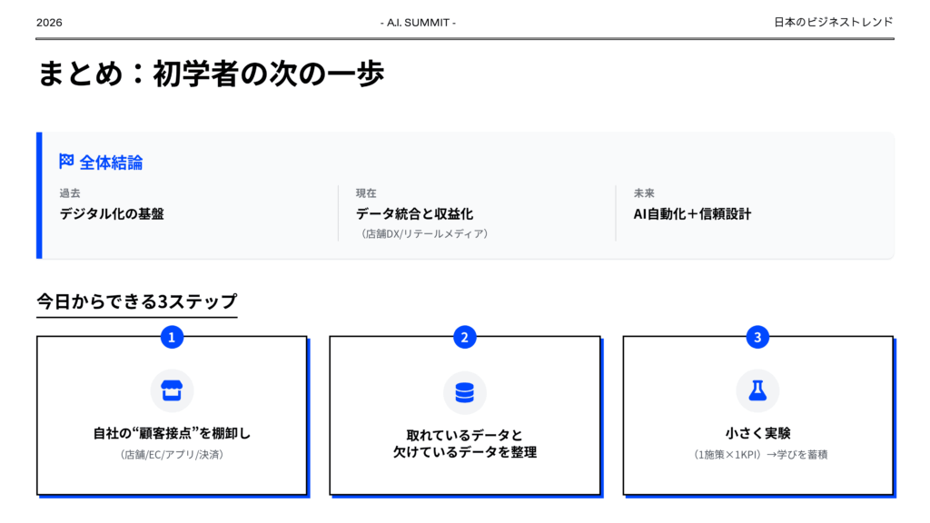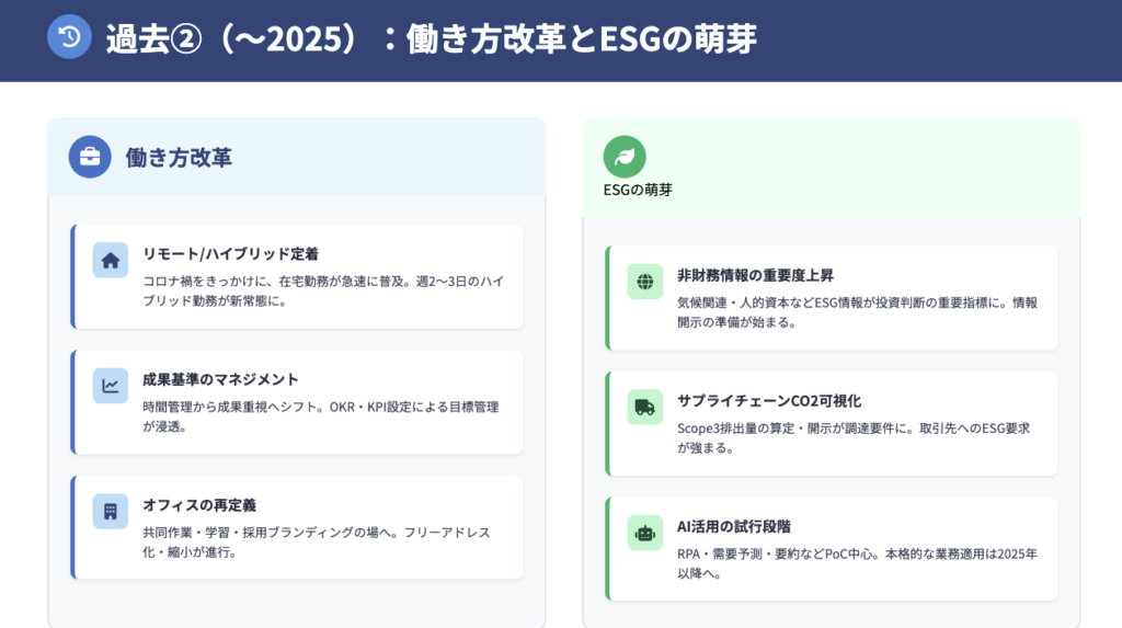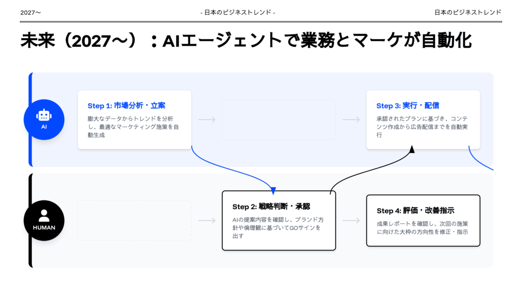 日本のビジネストレンドを過去、現在、未来の観点でまとめてください。