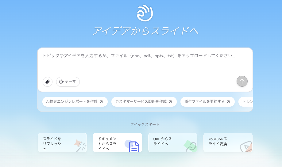 ログイン後の画像を見てもらえると分かる通り、Gensparkほど汎用的な機能はなく、スライド作成に特化したサービスといえます。