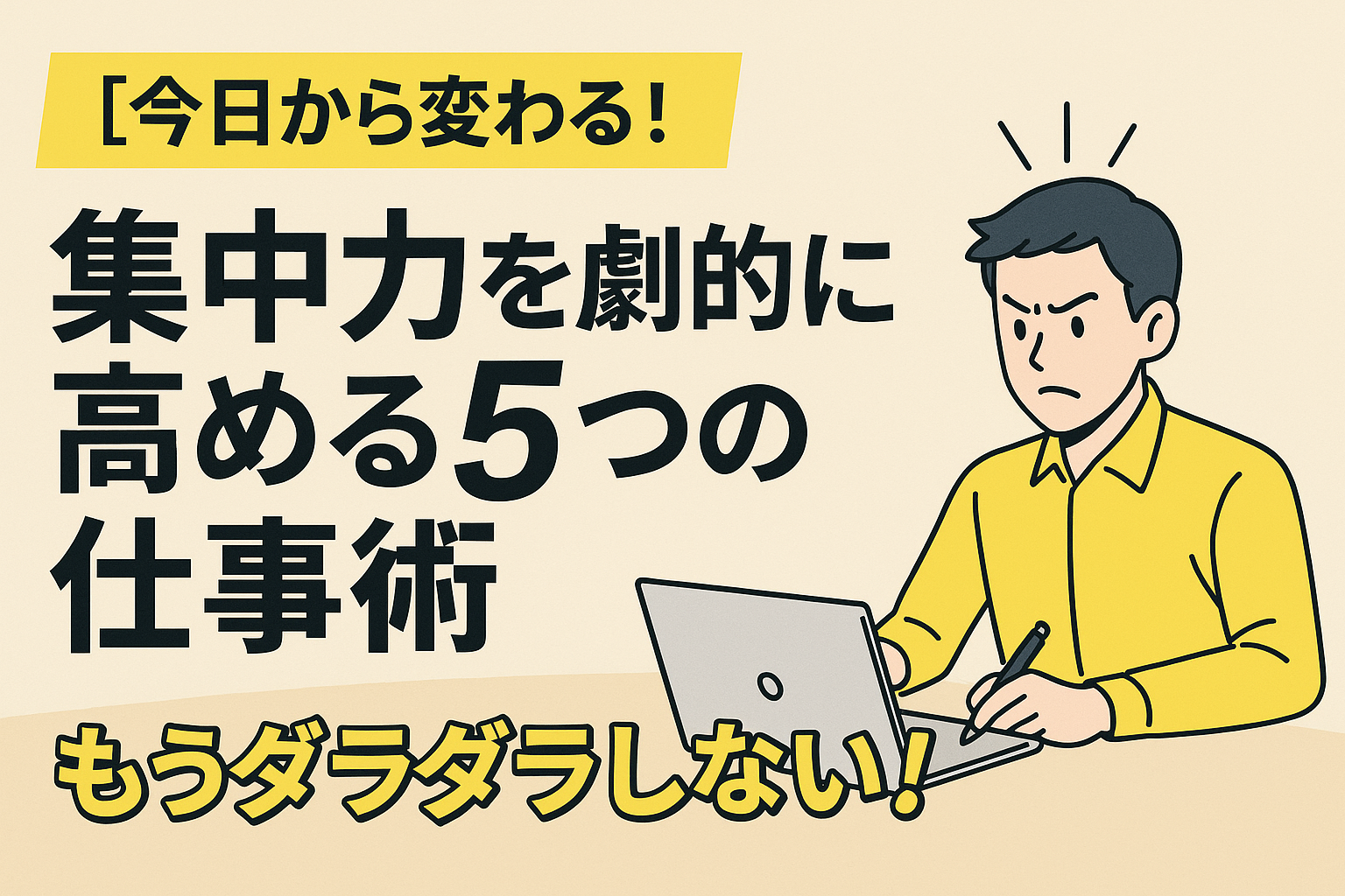 【導入】集中力を劇的に高める5つの仕事術で今日から変わる【仕事効率・生産性爆上げ】 「あー、またSNS見ちゃった…」 「ちょっと集中できたと思ったら、すぐに別のことが気になっちゃう…」 日々大量の業務に追われ、「もっと集中できれば、こんなに時間が... -